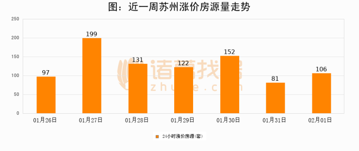 根据诸葛找房数据显示,苏州24小时涨价房源量为106套,较01月31日增加25套,环比上涨30.9%。与此同时,涨价房源占比小幅扩大,业主信心有所提升。