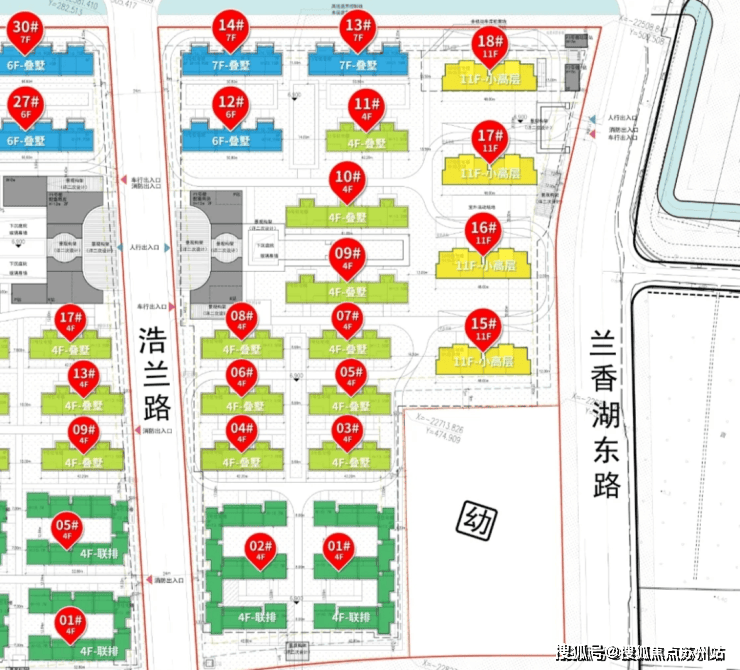 小高层楼间距约30米,联排楼间距约12.84~13米,4F鲁墅楼间距约16.3~22米,6-7F叠墅楼间距约20.1米左右!