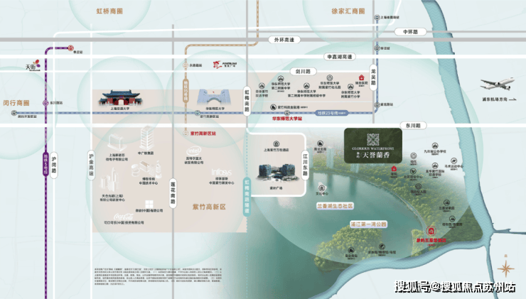 地块所在的紫竹区域占据浦江上游第一湾独特地理位置,核心区域有闵行第一大湖兰香湖,水域面积广阔,岸线绵延,湖光潋滟。