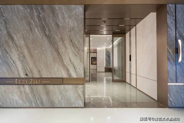 其次,项目还设置了无触入户大堂设计理念的首层单元门厅,业主人脸识别,即电动门自动打开。门厅的墙面两侧屏风为铂金钻石材重点装饰,顶面为曲面悬浮吊顶,给业主高端住宅般的归家体验。