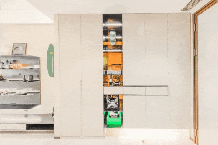 入户铸铝木门,内外双色,分别呼应公区和室内精装的主色调,质感碾压市面上统一装配的单色门;进门后左侧便是通顶玄关柜,带有静音阻尼、紫外线杀菌功能,精细化的分区足以容纳吸尘器、扫地机、行李箱、鞋子、各类杂物。