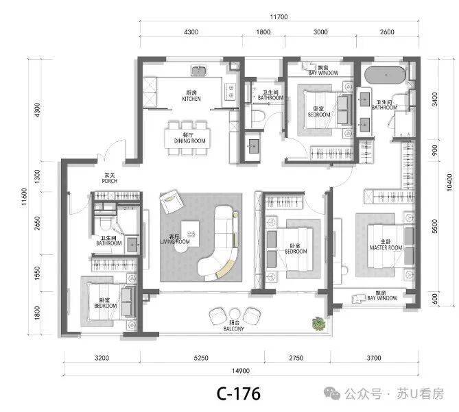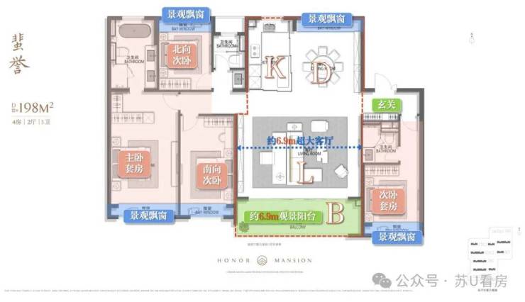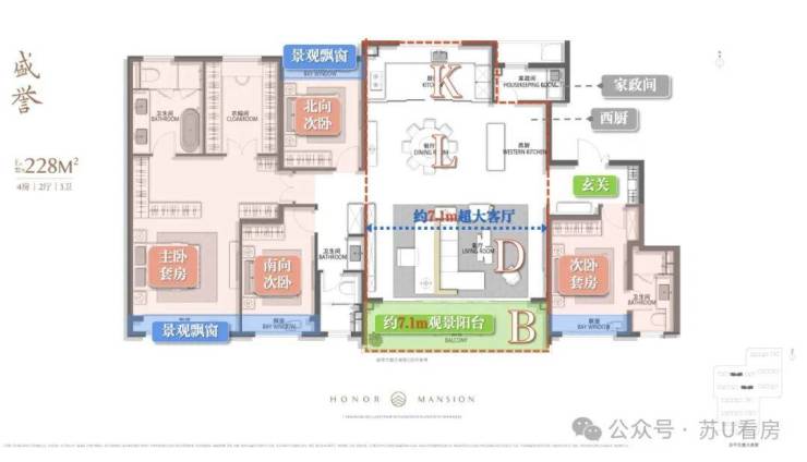 该户型LDKB一体化设计,u型厨房面宽约4.3米,客厅开间5.25米,双联阳台8米,豪华主卧套房设计。