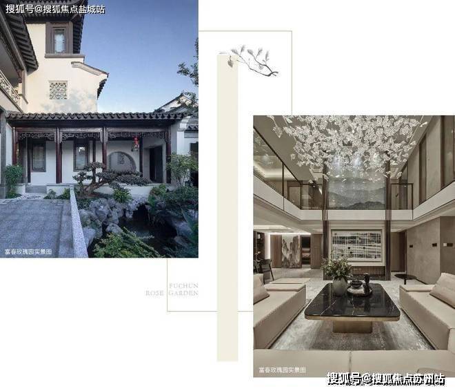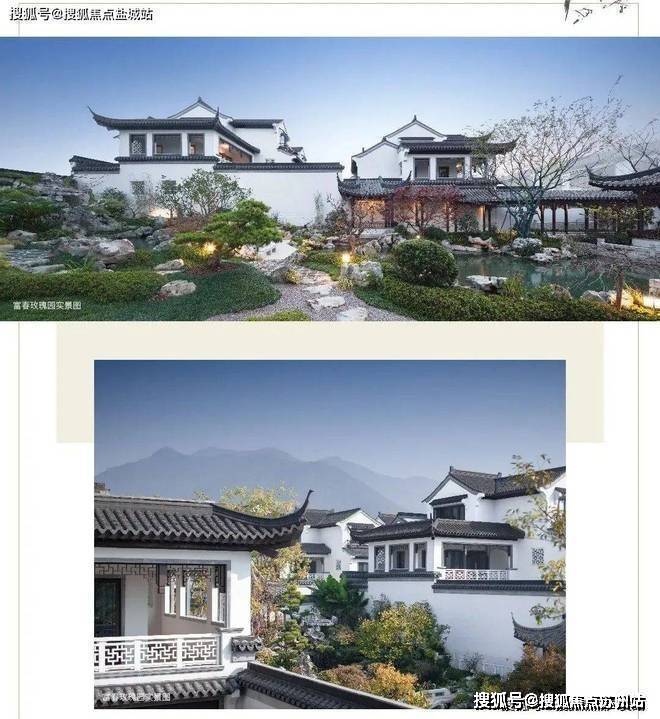 富春玫瑰园中国院子除传承绿城中式产品中的青瓦白墙、飞檐庑廊、影壁漏窗、水榭亭台等中式建筑元素外,为了不辜负从《富春山居图》中走出来的山水大境,在设计上我们还原苏州园林【园院宅阁】体系,极大限度的将富春山水收藏入室。