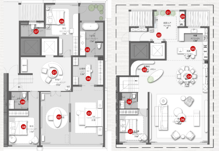 共6幢叠墅,包含上叠、中叠、下叠三类户型。户型设计包含私家庭院、电梯、地下室及露台等附赠空间,较高的空间附赠比例为业主提供个性化改造可能,通过引入自然采光与景观元素,增强室内外空间的关联性。