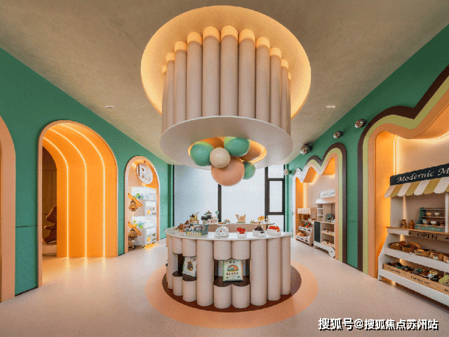 入口处蓝宝石岩板景墙璀璨如星河,指引通往奇幻世界的入口。热气球童话森林中绿植与艺术墙景虚实交融,瞬间点燃孩童的探索热情。