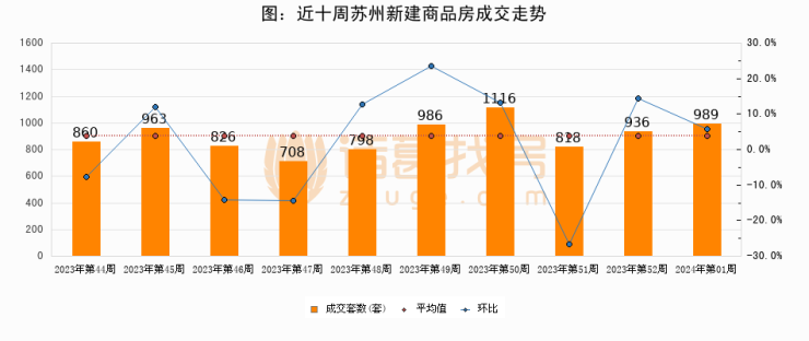 进入2024年第52周(12月25日-12月31日),苏州新建商品房成交989套,较上周增加53套,环比上涨5.7%