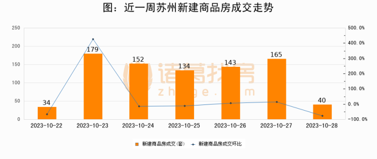 根据苏州市房地产市场和交易管理中心数据显示,2023年10月28日苏州新建商品房成交40套,较昨日减少125套,环比下降75.8%