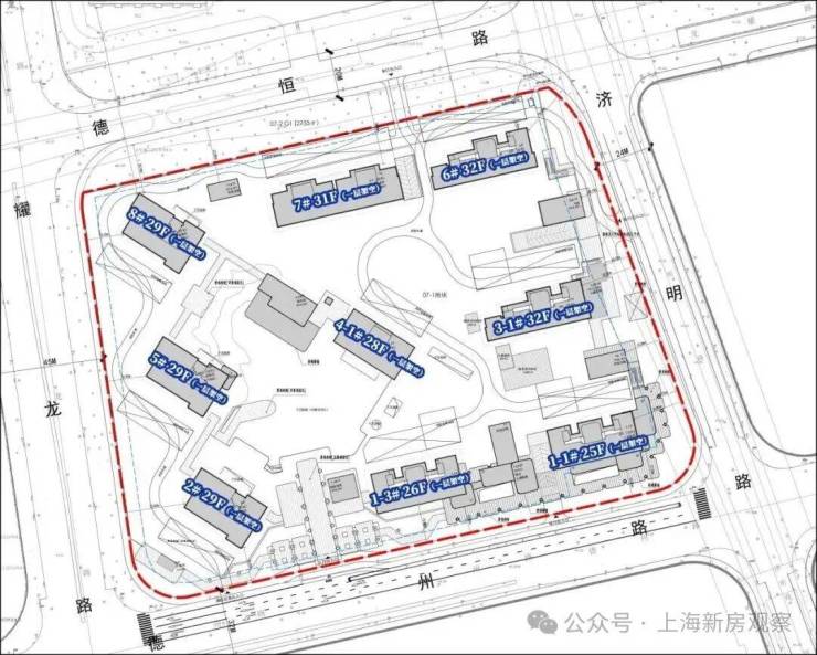 根据项目规划设计方案,项目拟建9栋25-32层高层住宅。全部楼栋均采用一层架空设计。项目采用完全式人车分流设计,人行主出入口位于德州路,三个车行出入口分别位于位济明路、德州路和德恒路。