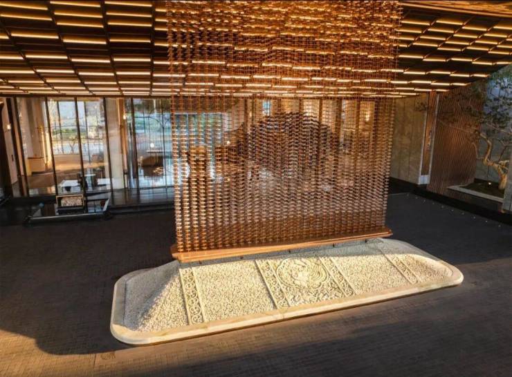 颜值与配置上,更是绿城炫技式的手笔。比如会所设计中将“凤羽”“梧脉”“潮声”等自然文化意象转化为“穹顶光厅”“旋梯”,以漆绘工艺为笔,螺旋而上,似凤舞九天、扶摇直上;在地面上,可以看到各类非遗古法工艺与东方白的天然大理石、水吧是采用伊朗进口天然石材孔雀玉打造结合而成,既呈现“东方美学”,又区别于市场上常见的西式奢华或传统中式,美出独立赛道。