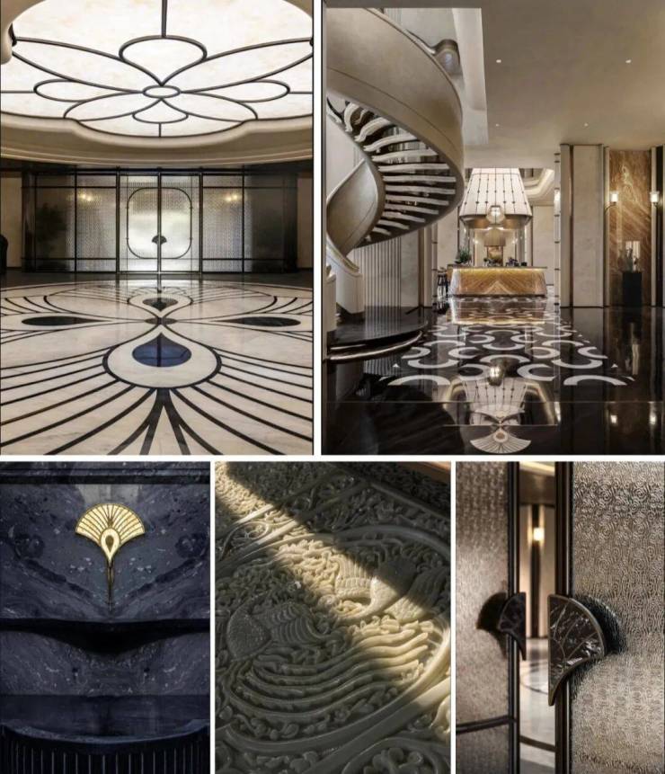 整座潮鸣会馆,仿佛一座「奢石博物馆」。我粗略数了下,天然石材多达数十种:加纳灰、凯悦白、新雅灰、印象多哈、紫气东来、彩虹印象、孔雀玉、林海雪原、翠谷幽兰……