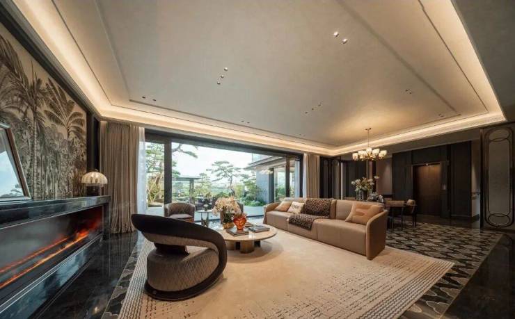 其次,突破传统别墅采光难题,高窗地比的设计,使室内空间通透敞亮,大面积玻璃窗模糊了室内外界限,将自然景观纳入生活场景,实现“借景入室”。