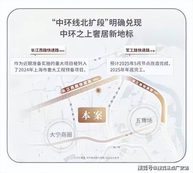 交通方面:项目紧邻长江西路地铁站(直线距离约150米),1站江杨南路,5站复旦,7站五角场。中环线北扩段明确兑现,军工路快速路25年开工,长江西路快速路列入上海市重大工程清单预备项目,快速链通城心,随着中环线北扩段的政策明确,淞南将正式进入中环时间。未来经逸仙高架,进入南北高架、内环高架、中环高架,可快速链通南北上海。