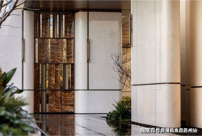 6、 社区含“奢材”量很高。门庭延街的外立面,以精工定制弧形 米色石材为主调,镶嵌典藏级 老虎玉大理石,点缀 古铜色现代海派艺术感灯器,整体呈现出百年海派的贵雅气质。