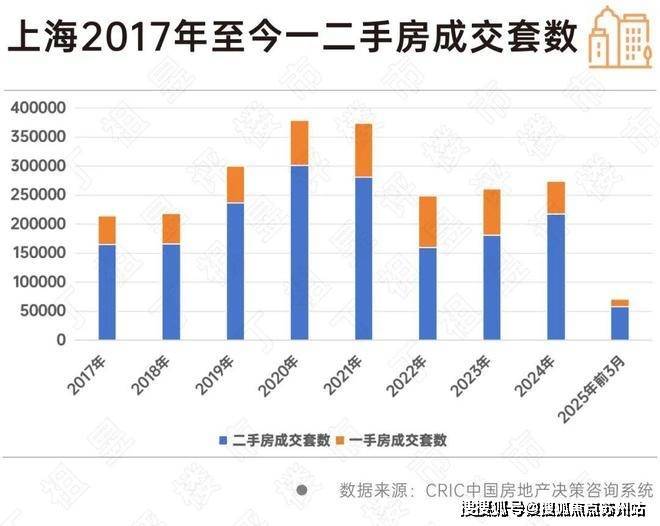 CRIC数据显示,2017年至今,上海一二手房成交套数的比值一直在1:3左右,也就是说每卖1套一手房就有3套二手房成交。从成交套数来看,二手房占据绝大多数。与此同时,虽然一手房经常出现较高成交价格,但上海二手房套均总价一直在300多万元/套,2025年一季度上海二手房套均总价为352.56万元/套。