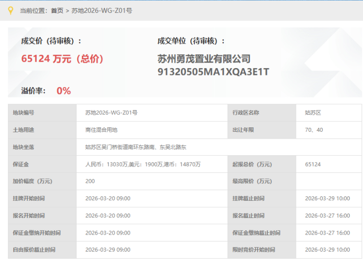 金茂姑苏南门1号地块项目,即,苏地2026-WG-Z01号地块项目,位于姑苏区吴门桥街道南环路南、东吴北路东,3月29日,金茂以底价65124万元竞得,成交楼面价9595元/平。