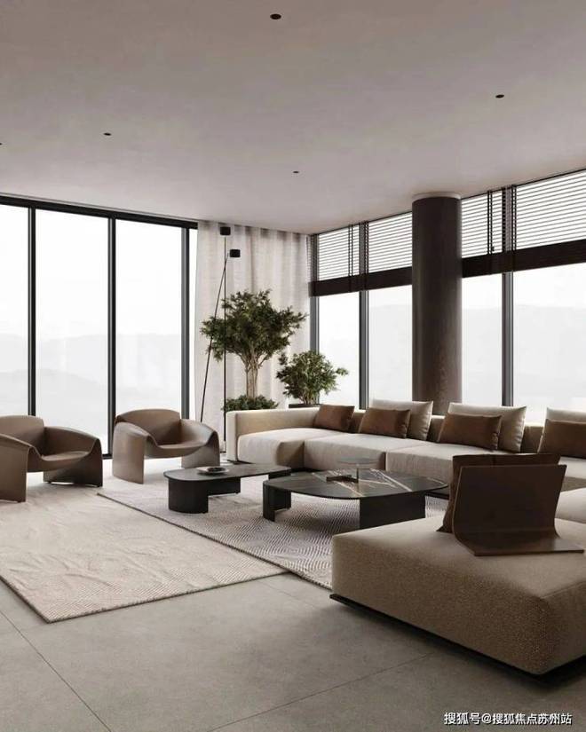 客厅中,蓝城丹枫云庐售楼处电话☎:400-882-8814(预约热线)✔✔✔设计师选用暖灰色作为空间的主色调,奠定整体沉稳的空间基调。灰白色的布艺沙发搭配上造型简洁的黑色大理石茶几,形成了色彩上的对比。大理石上细腻的纹理丰富了空间的细节,提升了整体的质感。大面的落地窗保证了室内拥有充足的光线,给人明亮的视觉感受。电视墙的设计十分简洁耐看。
