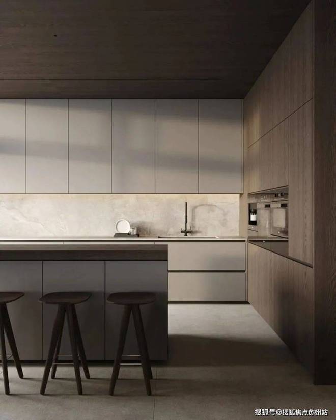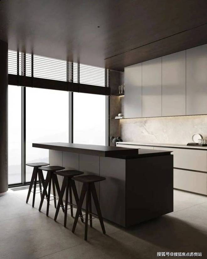 餐厅与厨房位于客厅的旁边,选用深色作为主色调,与客厅形成了对比。同时厨房做成了开放式的多功能厨房,包含了就餐、吧台与厨房功能,很好的利用了空间,兼具美观性与实用性。深色的餐桌搭配上餐椅,为屋主打造出了一个舒适的用餐空间,餐桌上方的吊灯十分吸睛,具有线条美感。