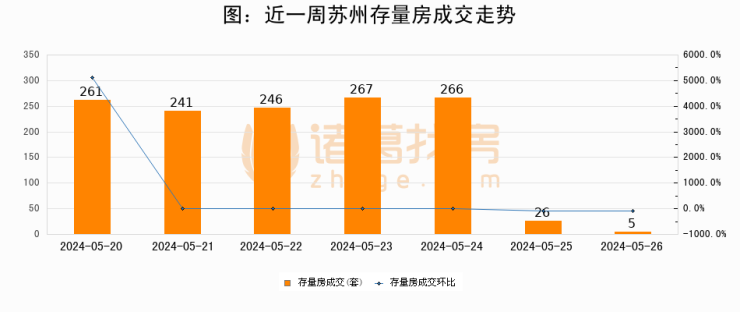 从存量房来看,2024年05月26日苏州存量房单日成交5套,比昨日减少21套,环比下降80.8%。从近一周存量房成交来看,苏州存量房日均成交套数为187套,05月26日单日成交5套,低于近一周平均水平97.3%。