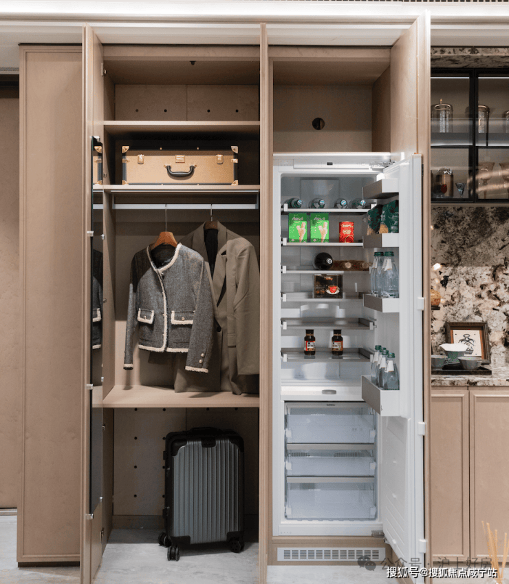 比如说餐边柜+操作台+洗手台一体化设置,让这个空间不再单独的满足于简单的吃饭、客厅休憩。