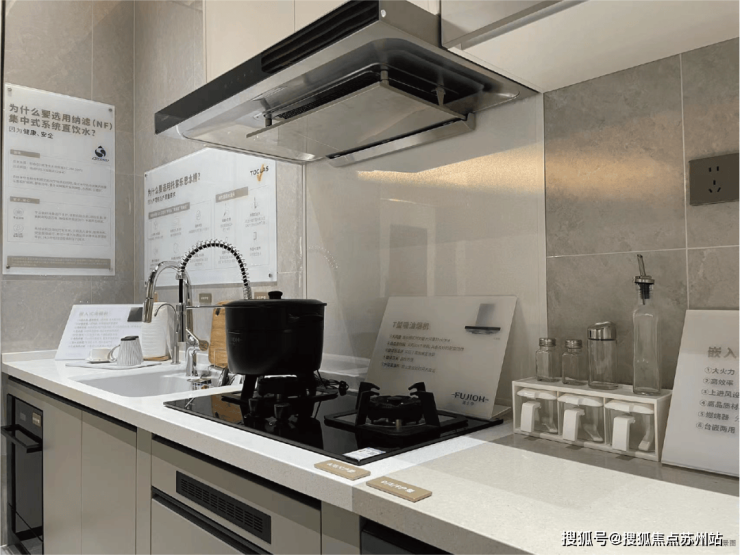 厨房水槽部分采用人造石材质的单槽,相比不锈钢更耐热、耐撞击。使用的是大单槽,各式锅具等大件物品都可以轻松打理。台盆安装采用无缝拼接手法,台面和水槽之间几乎没有死角,更方便清洁。厨房龙头选用托客乐思抽拉式水龙头,其前身是以乐器和运动体育用品著称的雅马哈,抽拉式设计可以轻松清理水池的各个部位。油烟机、燃气灶、洗碗机、蒸烤一体机等采用富士帝品牌(洗碗机、蒸烤一体机仅部分户型配备)。