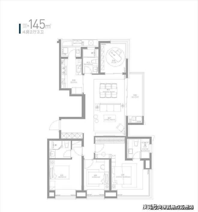 约145㎡四房分布于景观中央位置,可直面一线双水系河景。大横厅搭配270°景观视野,可能是临港主城目前在售户型中,景观视野王者户型。