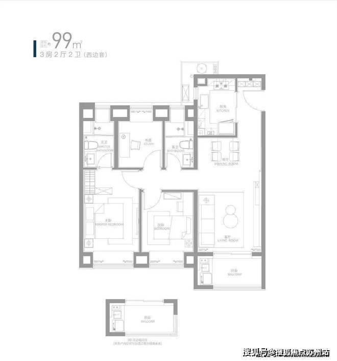 约99㎡三房,全卧室+卫生间均带飘窗,清风光影景色宜人。