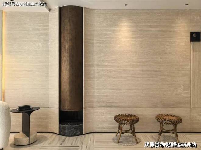 在客厅内,电视背景墙采用了进口的米色石材,其设计为弧形,加工难度极大,耗时是常规石材的三倍。此外,旁边的壁龛也包含在交付范围内,既实用又美化了空间。