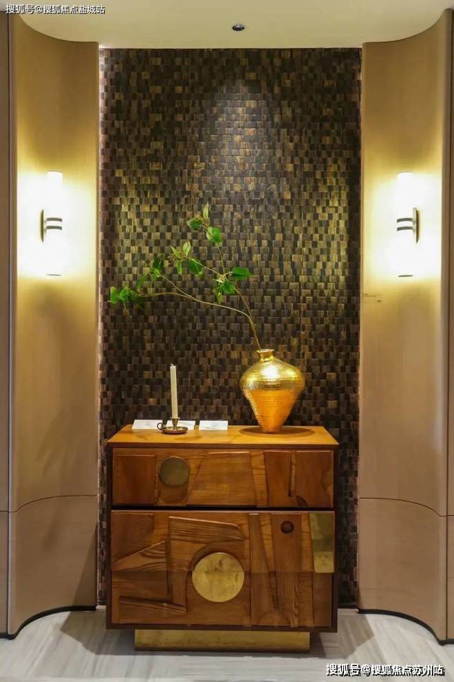 进门之后正对艺术玄关,背景为威尼斯棕石材(交付),在两侧设置弧面半包裹造型(交付),给到满满的归家仪式感。