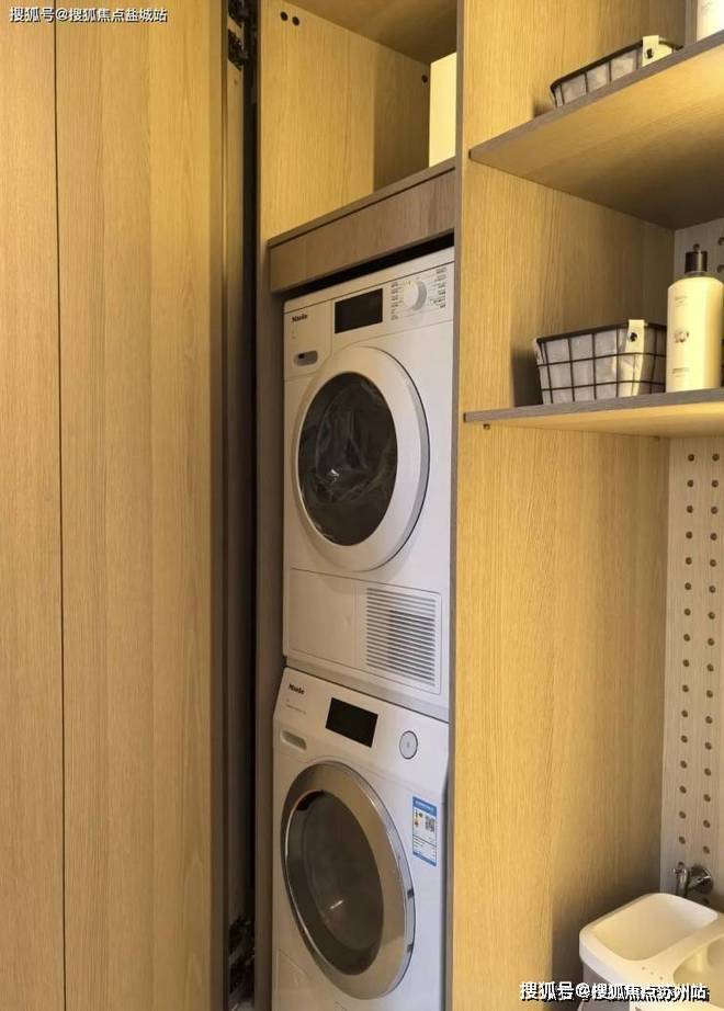 北次卧门外设有一个家政空间,深度超过60厘米,内含洗烘套件及大量收纳空间。采用隐形门设计,既实用又兼具美观。
