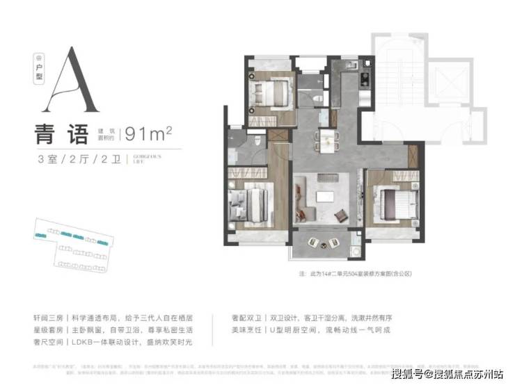 ➤建面约91㎡,经典的三开间朝南,不仅做到了全功能三室2卫,老人房与主卧分区设计,尊重两代人的生活习惯。还实现了小户型LDKG一体化奢宅化系统概念,实现生活的进阶享受。