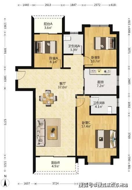 更为难得的是,在不缩减卧室空间的同时,连接阳台、餐厅的方正客厅,又能保证公区的舒适体验。