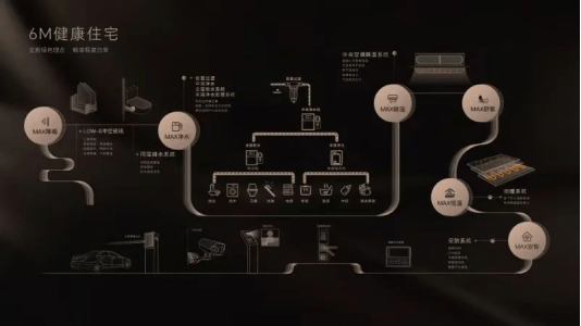 全屋配置6M健康智能住宅系统.这个智能系统系统涵盖降噪、净水、除湿、恒温、安智等多方面: