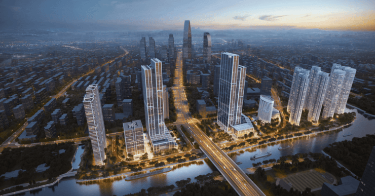 270°全玻天幕立面:采用银白色铝板+超白Low-E玻璃幕墙,最长连续玻璃面达70米,推窗即见京杭大运河一线水景,采光与视野在苏州高层住宅中罕见。