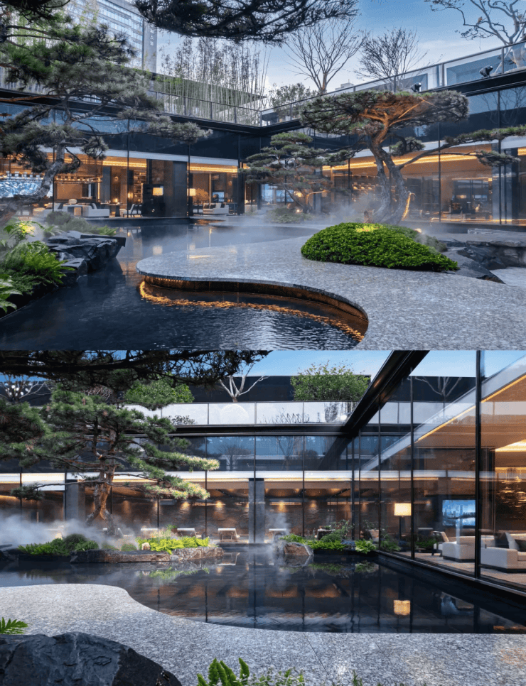 社区园林:以“三进式归家礼序”打造,鎏光华堂、拾光艺廊、浮光水庭,融合艺术与自然,打造“城市中的东方园林”。
