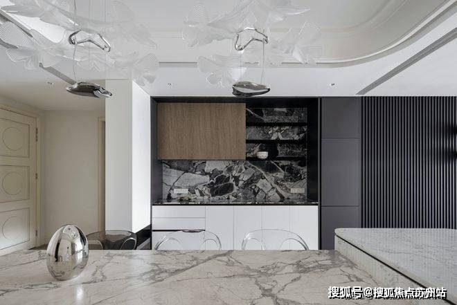 就餐厅暂离传统的固定设计方式,采用更新颖的设计方法缔造潮流惊喜。餐桌联合岛台,扩展用餐面积,赋予更加灵动洒脱的形态。另外通透亚克力支柱呈现的隐身姿态,赋予空间更温馨淡然的氛围。
