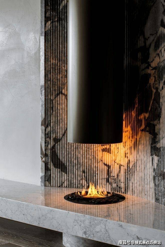 弧式吊顶联同艺术圆状壁炉,实现柔化效果,转而融入整体家具风格之中。每一处空间角落,皆彰显着统一格局,迎合顺畅流线的渲染,构建出非常完整的温馨家居环境。