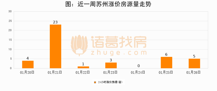 根据诸葛找房数据显示,苏州24小时涨价房源量为5套,较01月25日减少1套,环比下降16.7%。与此同时,涨价房源占比小幅回落,对于购房者来说是一个入市窗口期,购房者可抓住时机入市。