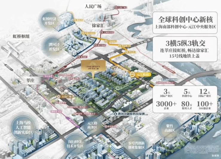 未来将以科创产业为动力,引入100多家五百强企业,吸纳80万全球高端人才,建设商业休闲、优质教育、文化体育、城市公园等综合公共配套设施,打造创新、人文、生态高度融合的中央服务区,引领未来都市理想生活,为闵行描绘一幅充满无限可能的蓝图.