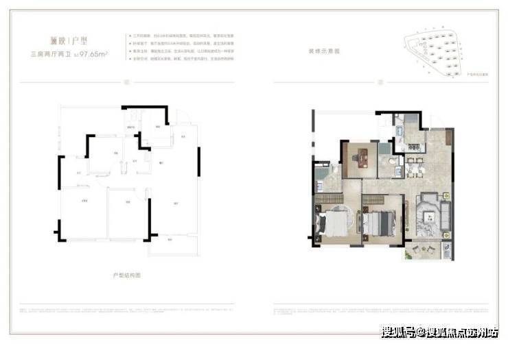 其中, 建面约98㎡的户型做了三房两卫,客厅及两卧室朝南,横向开间达到近 10 米的面宽。整个户型动静分区设计,既最大化利用空间,又保障私密性。