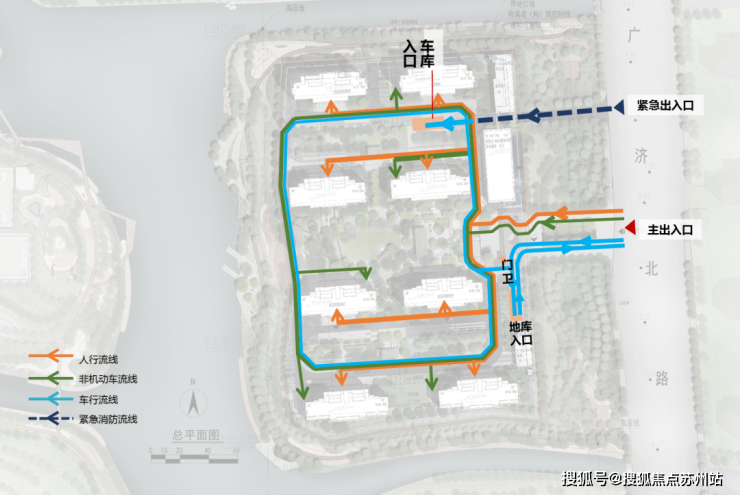 项目采用人车分流的流线形式。以纵横轴线为基准,沿着流线布局景观节点,收放有致,带来园趣十足的归家体验。