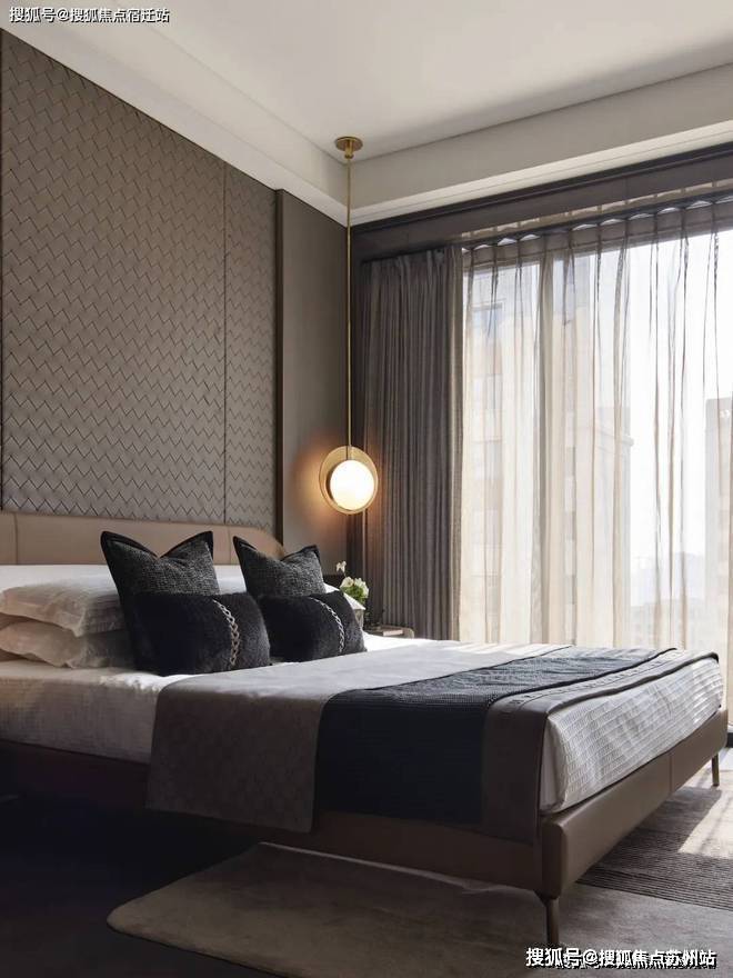 客房床头背景墙利用墙板做了凹凸造型突显层次感,简单不单调;走廊的胡桃木色墙板延伸进来变作衣柜,是这个空间与外部空间的链接。古北壹号公馆售楼处电话☎:400-882-8814(预约热线)✔✔✔
