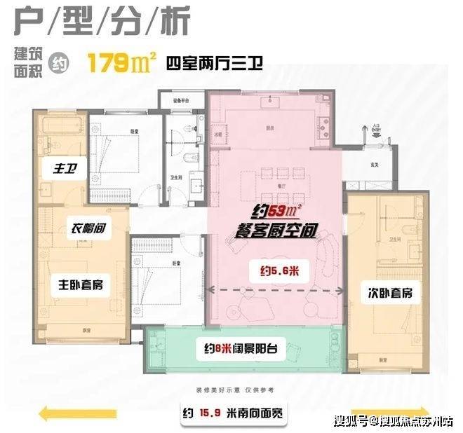 建面约179m²4房3卫,南向双套房,再加上北房间类套房, 全屋相当于3个套房,不论是二胎、三胎或是与老人同住家庭的改善需求都能满足。