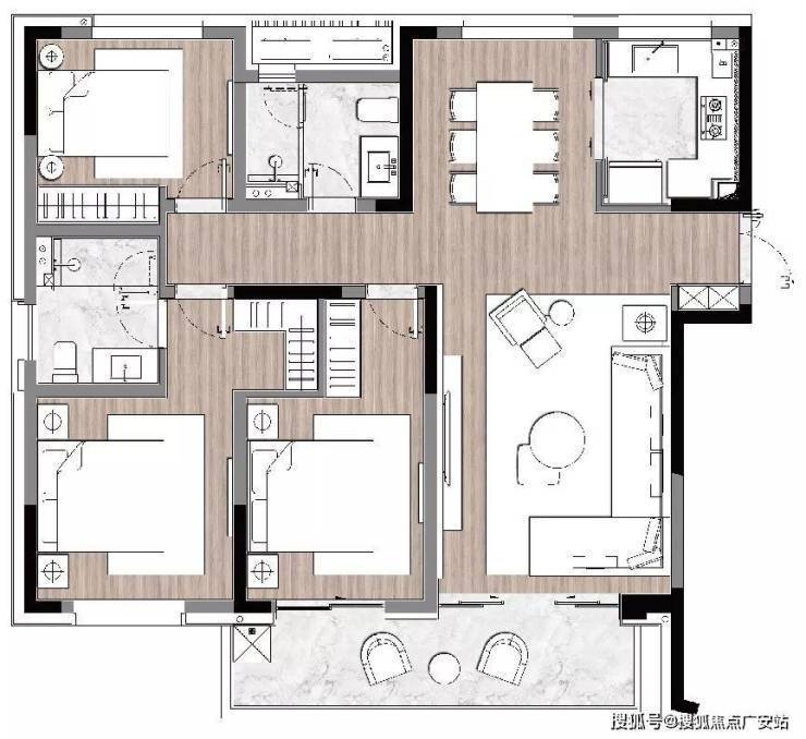 三开间朝南格局与大面宽的设计,客厅、餐厅、厨房一线贯通,南北通透,空间更显宽敞。