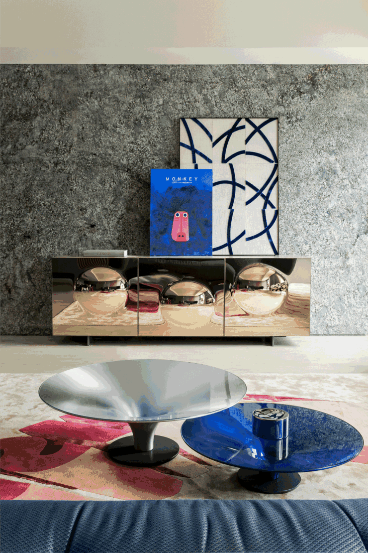这幅蓝色调的艺术作品与粉色花纹地毯巧妙融合,既展现出灵动的活力,又散发出时尚的气息。这样的混搭风格不仅彰显出居住者的个性品味,更让空间充满了艺术气息。