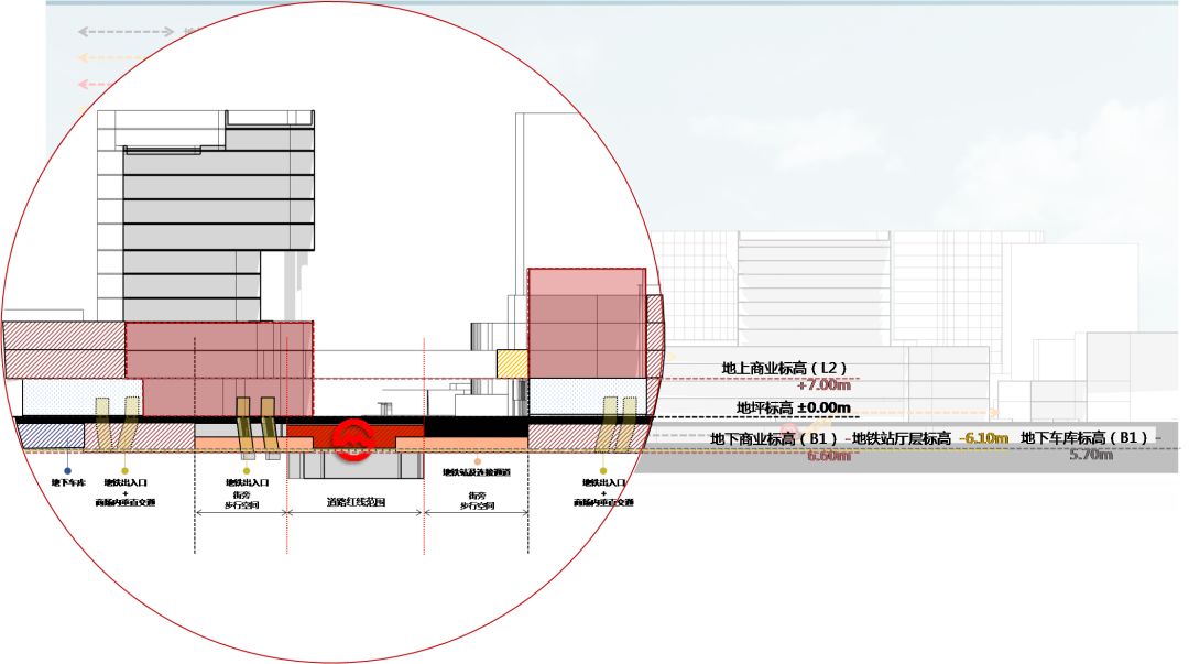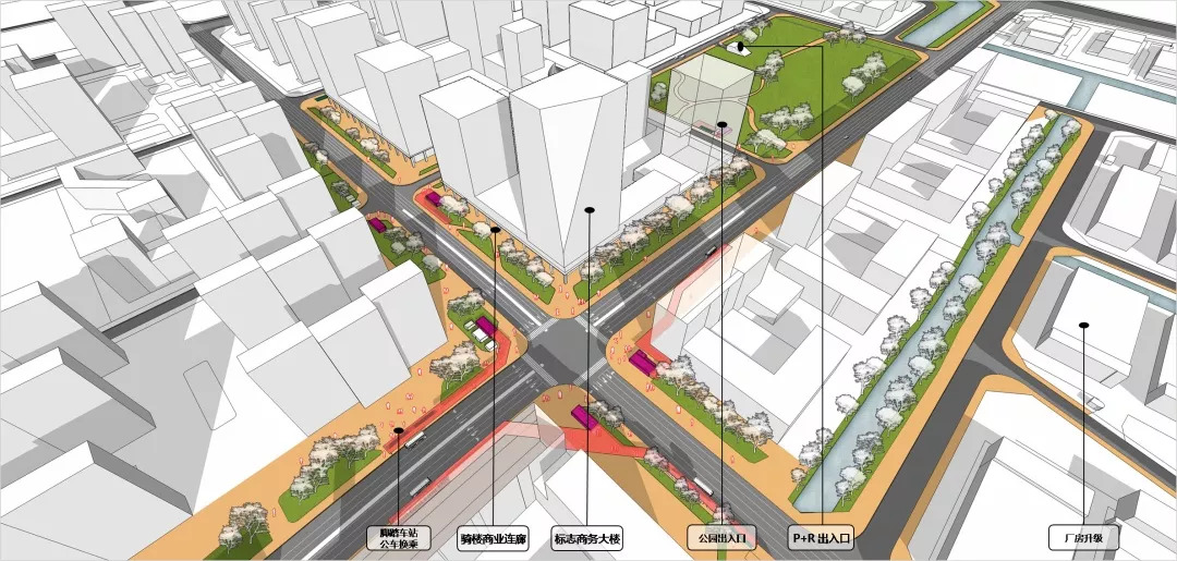 结合站点周边用地性质,在保留现状部分既有构筑物基础上,布置商办综合体、街旁活力街区、SOHO综合体、城市广场、市级商贸中心等设施。