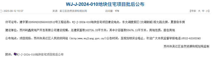 8月12日,吴江自然资源规划局官网发布了WJ-J-2024-010地块住宅项目(即太湖天誉)批后公示。