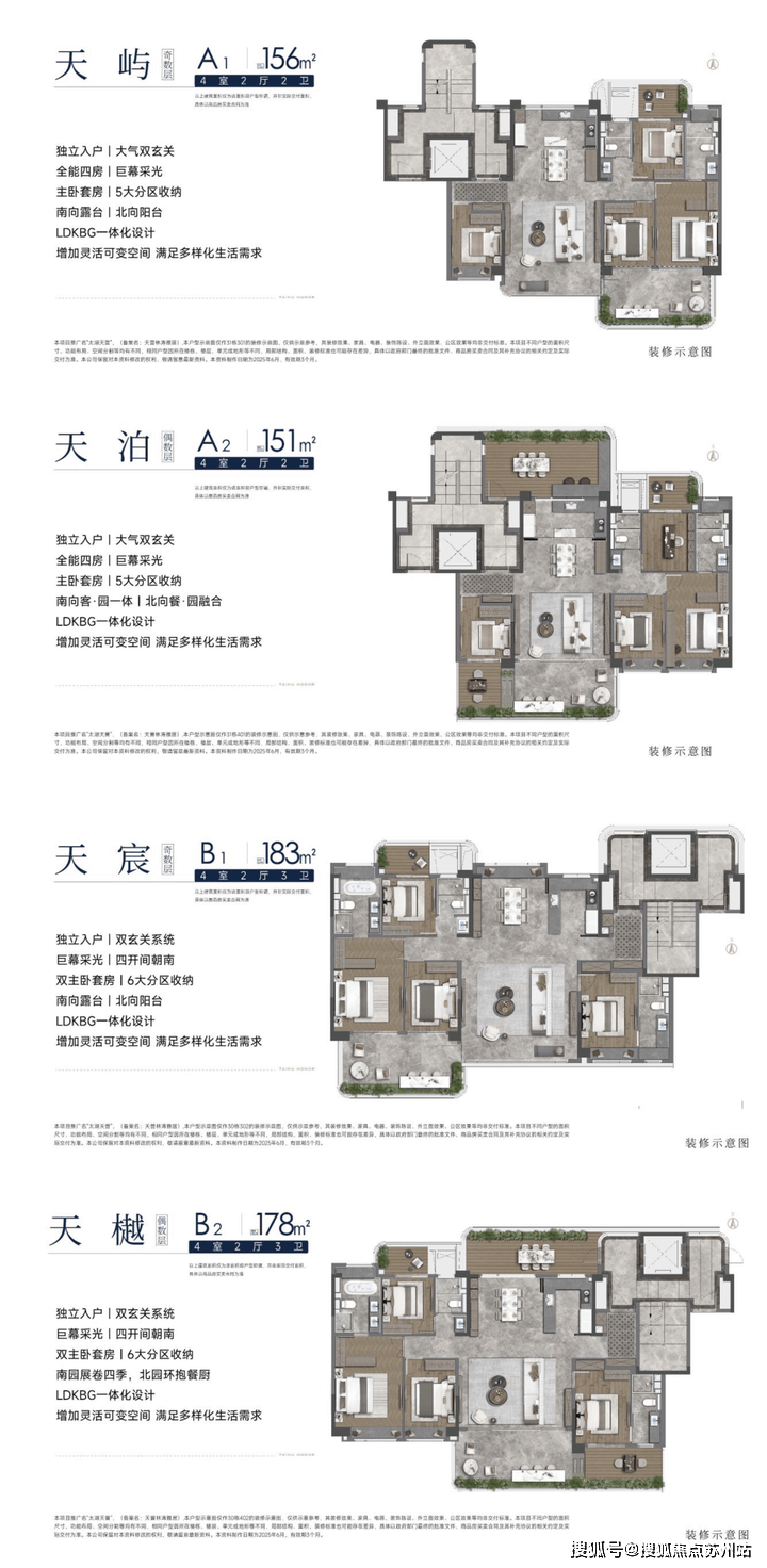 主力户型包括:建面约151-188㎡四代浮岛洋房,户户花园,南北阳台+露台;建面约198-213㎡栋式叠院,上叠270°法式灵动露台,下叠独门独院,带花园+地下室。此外,项目还自带高端会所。