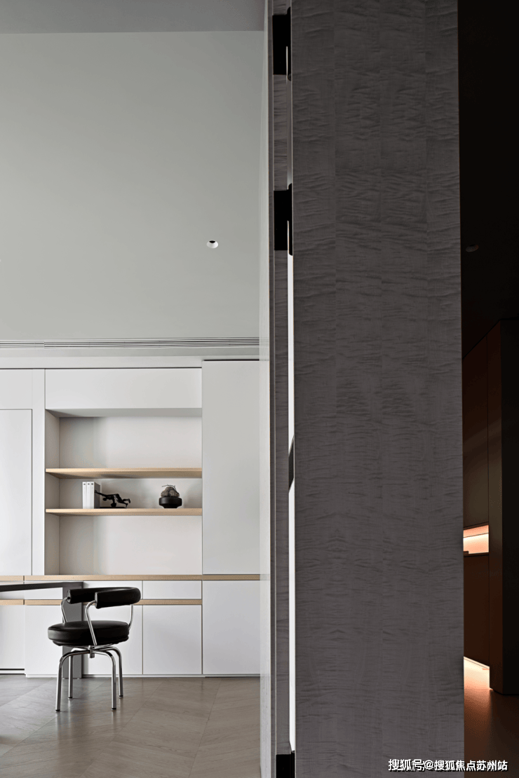 室内整齐划一的体块蕴藏着生活无限的奥秘,在隐形之中便诉说了无限的可能。极具层次感的墙面随之出现在视野内,构造了一种井然有序的美感。