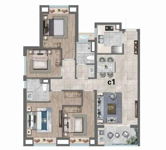 该户型附加空间很足,四口之家或是三代同堂都有非常好的居住体验.