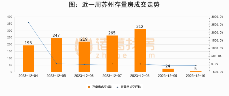 从存量房来看,2023年12月10日苏州存量房单日成交5套,比昨日减少19套,环比下降79.2%。从近一周存量房成交来看,苏州存量房日均成交套数为180套,12月10日单日成交5套,低于近一周平均水平97.2%。